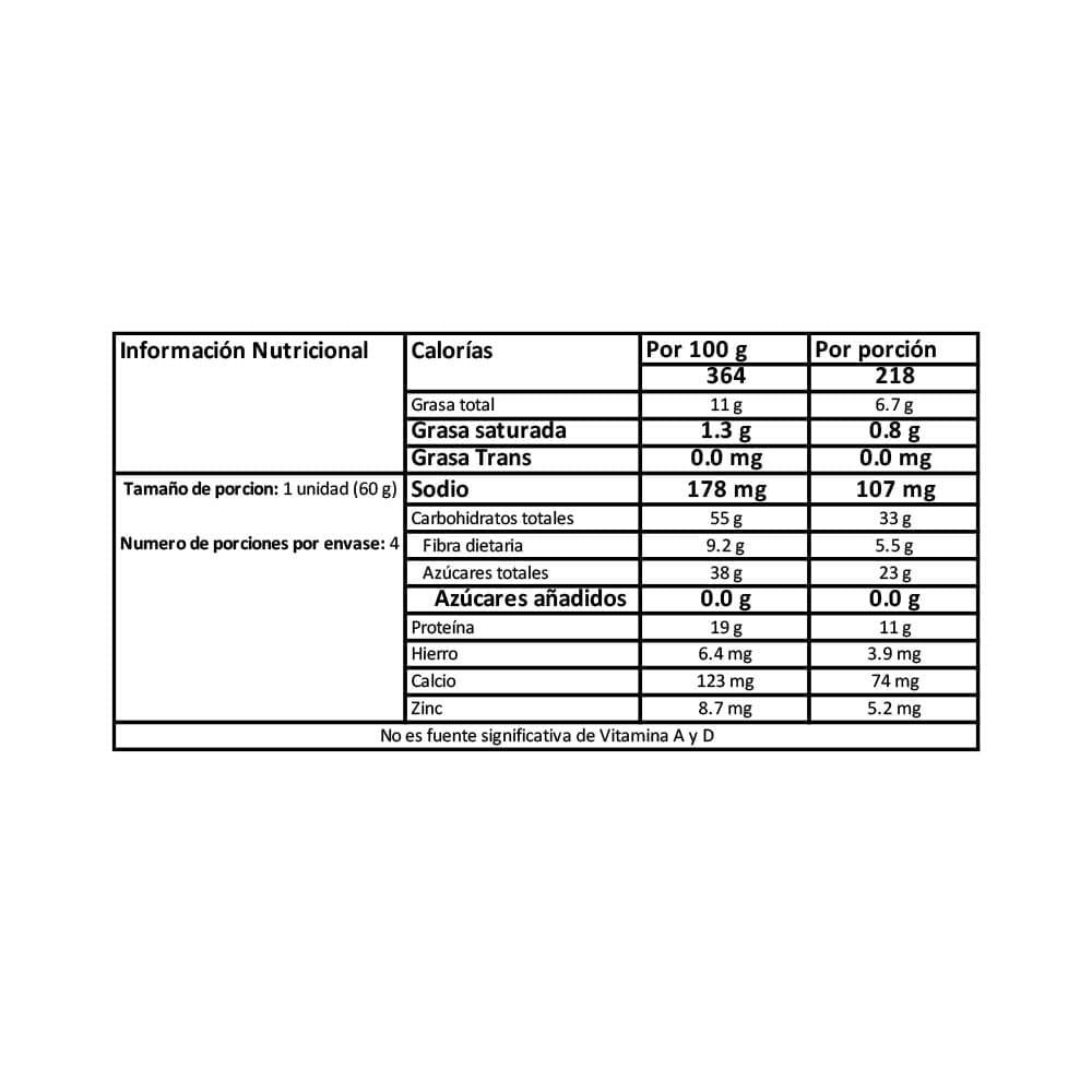 Información nutricional (porción): Tamaño de porción: 1 unidad (60 g) Número de porciones por envase: 1 porción Calorías 218, Grasa total 6.7 g, Grasa Saturada 0.8 g, Grasa Trans 0.0 mg, Sodio 107 mg, Carbohidratos totales 33 g, Fibra dietaria 5.5 g, Azúcares totales 23 g, Azúcares añadidos 0.0 g, Proteína 12 g, Hierro 3.9 mg, Calcio 74 mg y Zinc 5.2 mg. No es fuente significativa de Vitamina A y Vitamina D.
